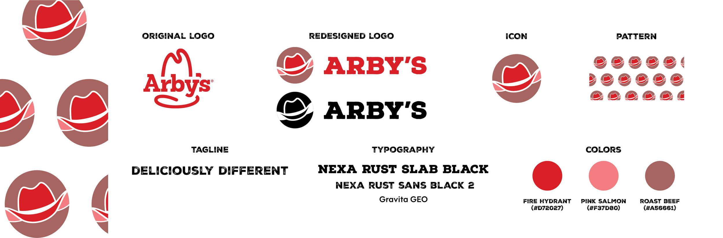 This logo redesign aimed to modernize the Arby’s brand while still focusing on the Arby’s staple: the ten-gallon hat. The hat had its charm, but if Arby’s wanted to appeal to a new audience and separate itself from the current view, it needed something new. I adjusted the brand colors to align better with other fast-food restaurants in the space while also adding a light pink/salmon as a nod to the restaurant’s roast beef. This new design changed the format of the logo and icon to be horizontal instead of vertical, aligning better with industry standards.