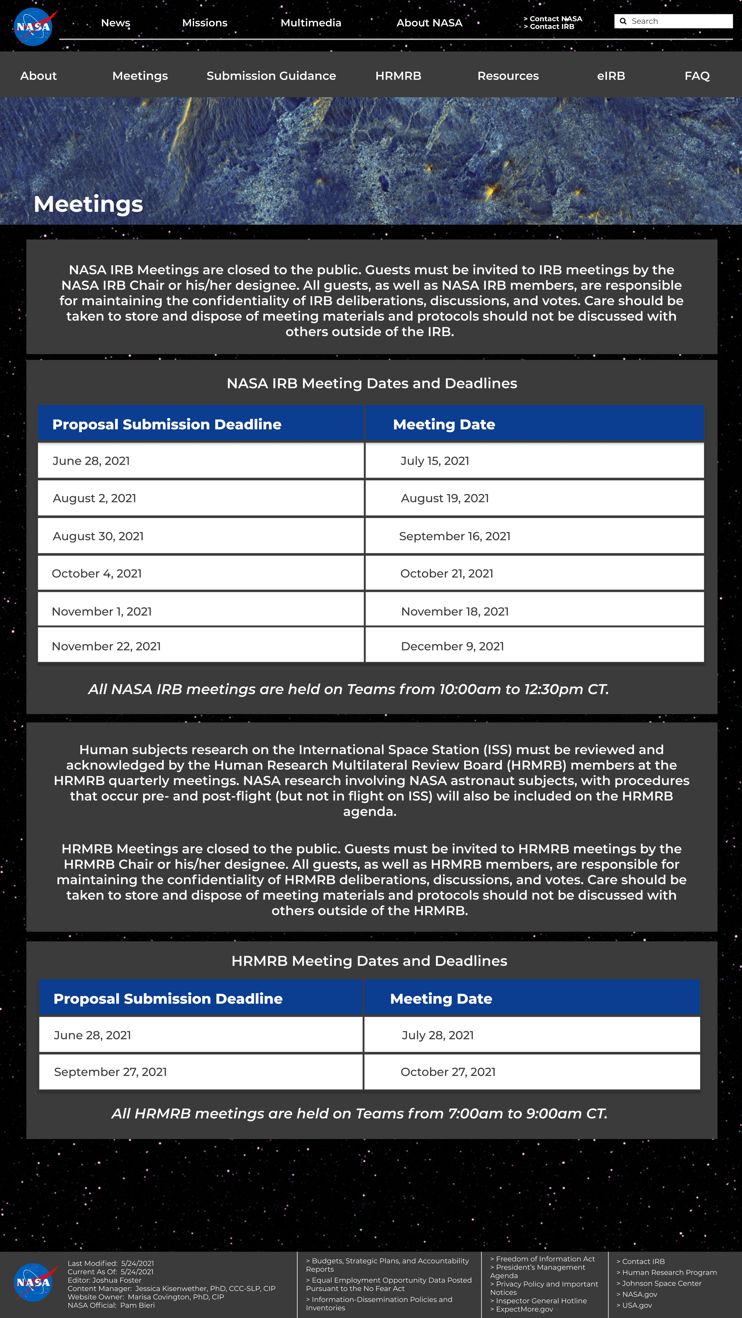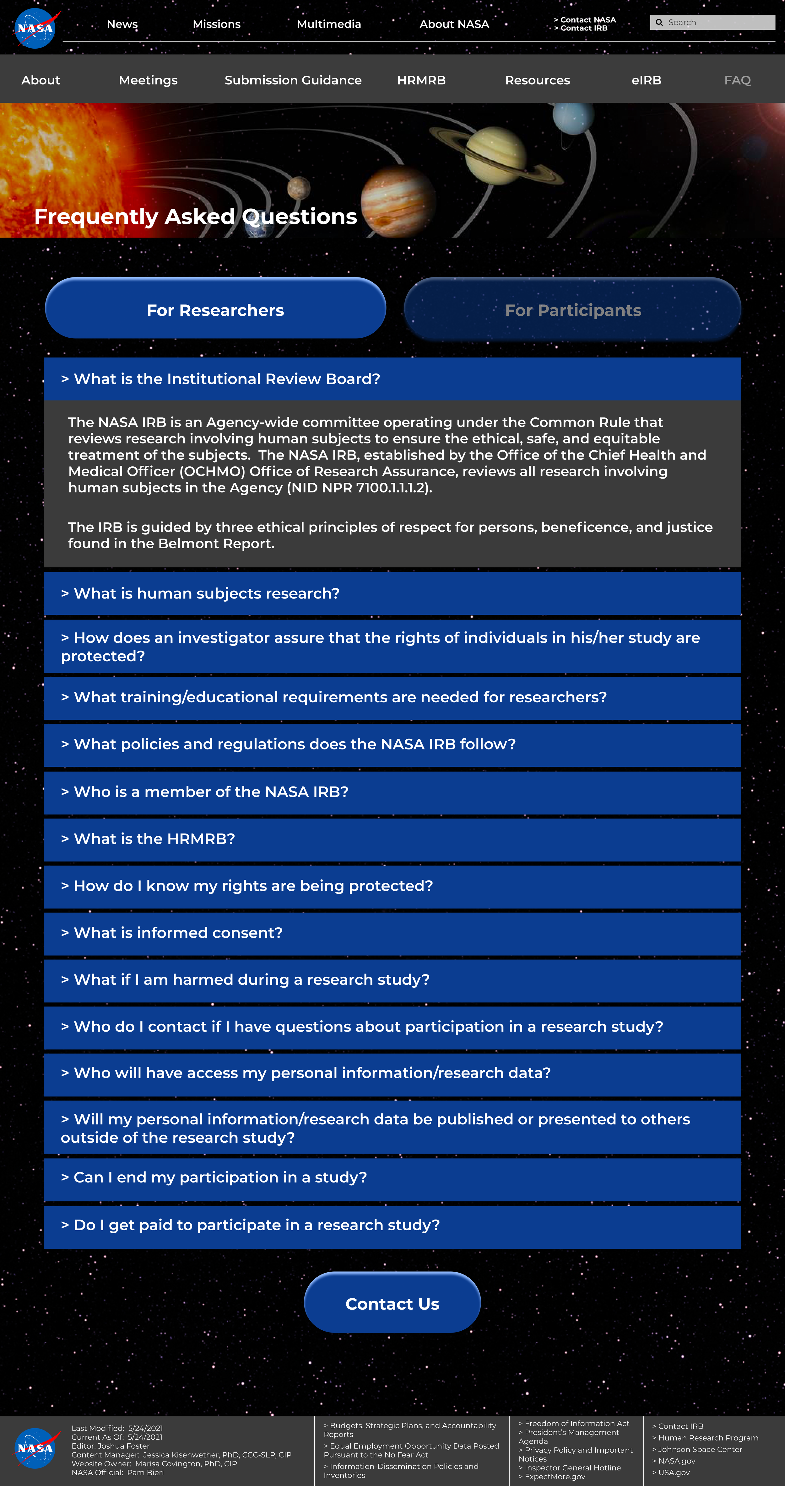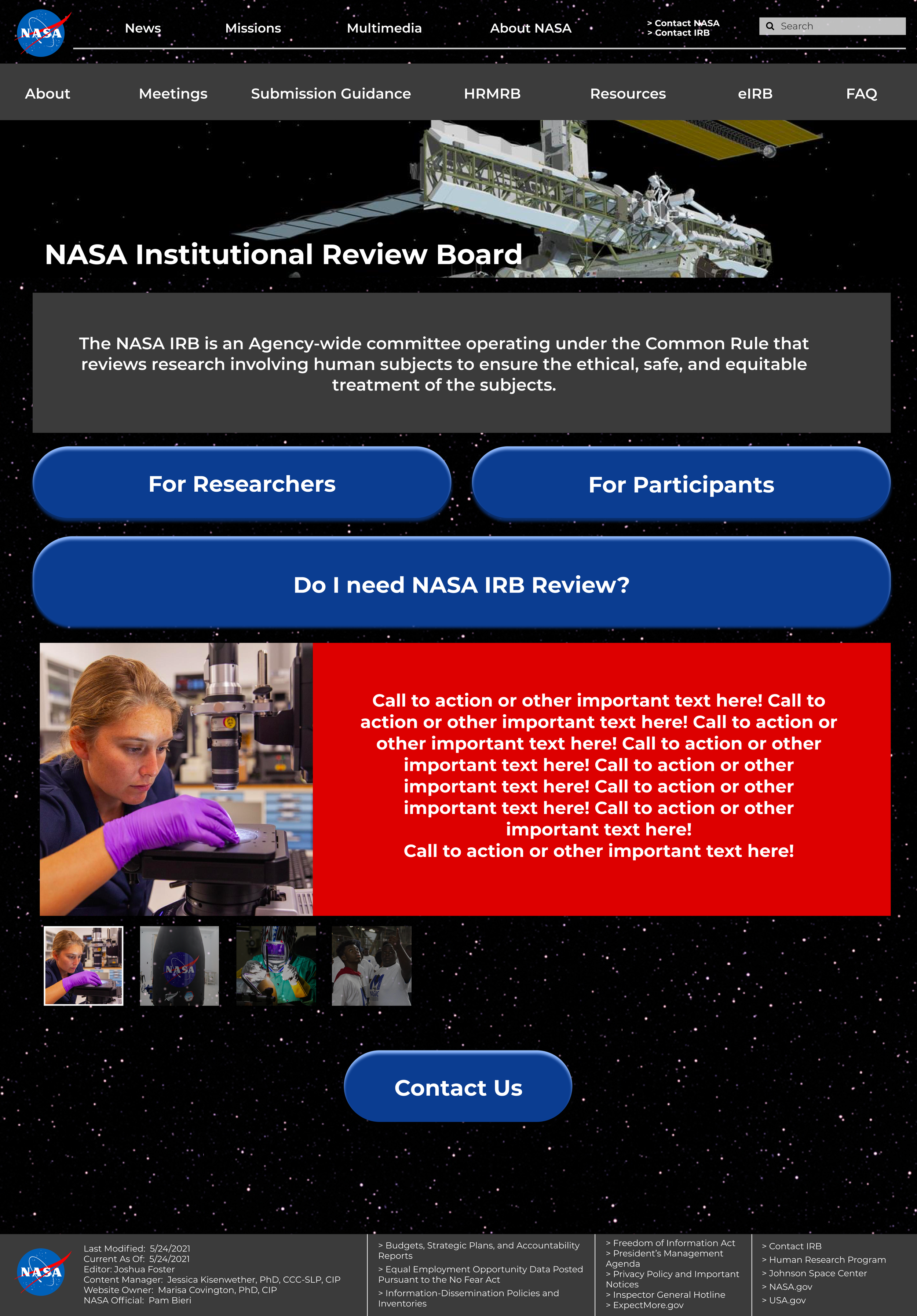 I redesigned their website during my web design internship from June to August 2021. As of July 2024, the IRB website has been decommissioned and is now part of NASA’s website.